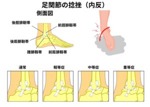 足首を内側にひねる「内返し捻挫」では、多くの場合、足首の外側にある**前距腓靭帯(ぜんきょひじんたい)**などが伸びたり断裂したりします。